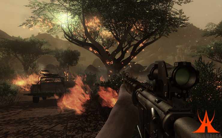 Far Cry 2 è un sandbox FPS, uno sparatutto che concede massima libertà al giocatore nell’affrontare le varie situazioni offerte offrendogli sin da subito la possibilità di esplorare gran parte dell’intera mappa di gioco senza interruzioni. Ciò si traduce in lunghi percorsi da fare a piedi o meglio con uno dei tanti veicoli a disposizione. Ciò che distingue Far Cry 2 dallo stuolo di FPS mediocri e tutti uguali usciti negli ultimi anni, oltre alla pregiata fattura tecnica, è senza dubbio la rappresentazione del fuoco, vero protagonista sin dalle prime battute di gioco. Potremo incendiare gran parte delle cose che vedremo nell’area di gioco, soprattutto alberi e sterpaglie, che si consumeranno realisticamente e più o meno rapidamente in base all’andamento del vento. Già, il vento, comprimario del fuoco, contribuirà (in maniera dinamica) a estenderne l’azione a seconda della sua intensità e direzione con un effetto abbastanza realistico e mai visto prima.