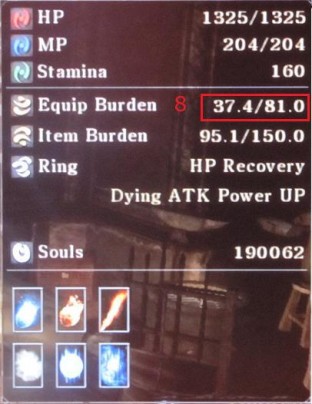Prima di passare alle armature, invece, c’è una cosa da fare: controllare il peso. Se avete addosso (Equip Weight) più di metà del peso equipaggiabile, la velocità di movimento cala e diventa difficile schivare (che in mischia è una manovra chiave). Un secondo controllo del peso si fa rispetto al peso trasportabile: lo determina Vitalità, e tanto più peso si trasporta, tanto meno loot si può portare a casa. Fatti questi controlli, si fa il conto per scoprire quanta armatura si può portare: (peso equipaggiabile / 2) – (peso dell’equipaggiamento, senza armatura) = peso massimo dell’armatura.