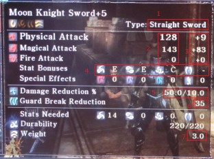 Le armi sono classificate per tipo: il tipo di un’arma definisce il set di mosse disponibili (nell’immagine a lato, box “1”). È la parte piu’ importante di un’arma, ma è anche la più soggettiva – ciascun giocatore decide con che arma si trova comodo, se un certo tipo di arma ha attacchi troppo lenti o troppo corti o cos’altro. Attenzione solo agli spazi: gli ostacoli fermano gli attacchi, perciò un’arma che ha nel moveset degli attacchi orizzontali molto ampi è più valida contro tanti nemici in un’area vuota che non uno stocco il cui moveset contempli solo l’affondo, ma in un’area ristretta vale il contrario (gli ostacoli o i muri impedirebbero all’attacco della prima arma di compiere il suo arco intero, mentre difficilmente intralcerebbero l’affondo dello stocco). Vale la pena studiare il moveset per capire quali attacchi sono ideali con un’arma, a seconda della situazione. Parlando del danno, la distinzione è diversa: tutte le armi “base”, cioè non upgradate, hanno un danno base (box “2”), ed acquisiscono bonus sia da Forza sia da Destrezza. Anche se tutti i bonus alla fine si sommano nella determinazione del danno, il “grado” di bonus piu’ alto definisce anche quali sono gli upgrade possibili per quell’arma (sono divisi per statistica, e per ciascuna vanno in ordine “S->A->B->C->D->E”; nell’immagine i valori effettivi del bonus sono nel box “3”, mentre il grado e’ nel box “4”). Per cominciare, gli upgrade di base sono necessari, prima di passare a quelli avanzati; per le armi da Destrezza servono le Sharpstone, mentre per le armi da Forza servono le Hardstone. Arrivata a +3 (o +6) con gli upgrade di base, un’arma è pronta per gli upgrade avanzati, con pietre diverse. Gli upgrade che ho trovato piu’ utili, per un’arma da Hardstone sono “Crushing” (alza a dismisura i bonus da Forza), “Blessed” (aggiunge un bonus molto alto da Fede), “Dragon” (cancella tutti i bonus ma aggiunge danno base da fuoco), “Moon” (aggiunge danno magico e bonus al danno da Magia). Per un’arma da Sharpstone, gli upgrade che ho trovato piu’ utili sono “Sharp” (alza di molto i bonus da Destrezza) e “Crescent” (aggiunge danno magico basato su Magia e rigenera mp). Attenzione: anche se armi dello stesso tipo hanno in genere path di upgrade uguali, fidatevi solo dei bonus, perche’ a volte ci sono delle eccezioni. Tra le armi si annoverano anche catalisti e talismani: nel gioco c’è un solo tipo di talismano normale, il Talisman of God, per cui per utilizzare i miracoli c’è poco da scegliere; e due tipi di catalisti per gli incantesimi (legno e argento). Quelli di legno sono un po’ più potenti (circa il 10%), mentre quelli d’argento alzano gli mp massimi.