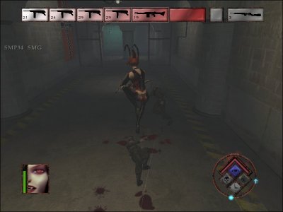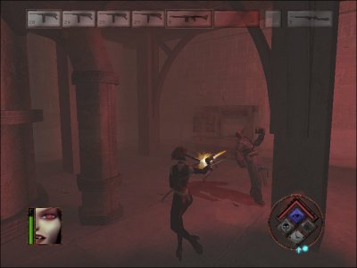BloodRayne è un titolo d’azione tridimensionale con visuale in terza persona, la cui protagonista, la già citata Rayne, è un raro esemplare di dampiro (di madre umana e padre vampiro) appartenente ad una società segreta (la Brimstone) che si occupa di indagini nel campo del paranormale e di metter fine ai sogni di gloria di cospirazionisti eccessivamente appassionati al mondo dell’occulto. La gentil donzella, ben lungi dall’atteggiarsi a novella Sherlock Holmes, predilige in maniera netta l’attività fisica in luogo di astrusi ragionamenti, per cui, in una mise da sadica dominatrice, va in giro per il mondo a menar fendenti attraverso un paio di lame attaccate ai polsi e varie combo letali. E’ inoltre perfettamente in grado di maneggiare delle armi quali pistole e fucili, con un comodo sistema di autopuntamento. I combattimenti corpo a corpo, però, si rivelano di gran lunga più soddisfacenti degli scontri a fuoco, sia per un’insita spettacolarità delle mosse (calci rotanti e compagnia cantante) sia perché danno un senso ad un gioco altrimenti macchiato indelebilmente da animazioni orribili: correre, saltare, persino battere le ciglia sono azioni rese nella maniera più innaturale possibile, troppo veloci eppure troppo goffe e meccaniche.