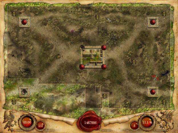 La fonte d’ispirazione è Qix, un vecchio coin op in cui bisogna disegnare dei rettangoli che arrivino a riempire una percentuale predeterminata dello schermo. Fortix eredita le stesse meccaniche di gioco, ma apporta qualche novità significativa. In primo luogo non bisogna chiudere indistintamente tutta l’area dello schermo, ma solo le zone con le fortezze da conquistare. In secondo luogo l’ambientazione è fantasy: ci sono dei draghi, delle torrette che proteggono le fortezze, delle balliste che possono distruggere le torrette previa attivazione, vari effetti speciali da raccogliere circondando un’icona a forma di pentacolo e, infine, un boss finale.